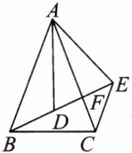 3. (贵州省中考改编)如图,已知 $ AB = AC $,$ AD = AE $,$ BD = CE $,$ B $,$ D $,$ E $ 三点共线,$ AC $ 与 $ BE $ 相交于点 $ F $,请从下列结论:① $ \angle ADE = \angle CAE + \angle ACE $;② $ \angle BAC = \angle BEC $,选择一个进行证明。