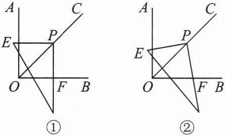 (2)把三角尺绕着点 $ P $ 旋转(如图 ②),两直角边分别与 $ OA $,$ OB $ 交于点 $ E $,$ F $,试猜想 $ PE $ 与 $ PF $ 的大小关系,并说明理由。
