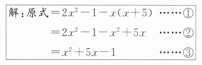 解:第①步,用平方差公式出错,第②步去括号出现错误.原式$=4x^{2}-1-(x^{2}+5x)=4x^{2}-1-x^{2}-5x=3x^{2}-5x-1$.