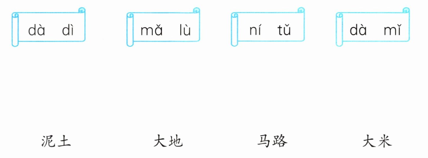 dà dì—大地,mǎ lù—马路,ní tǔ—泥土,dà mǐ—大米