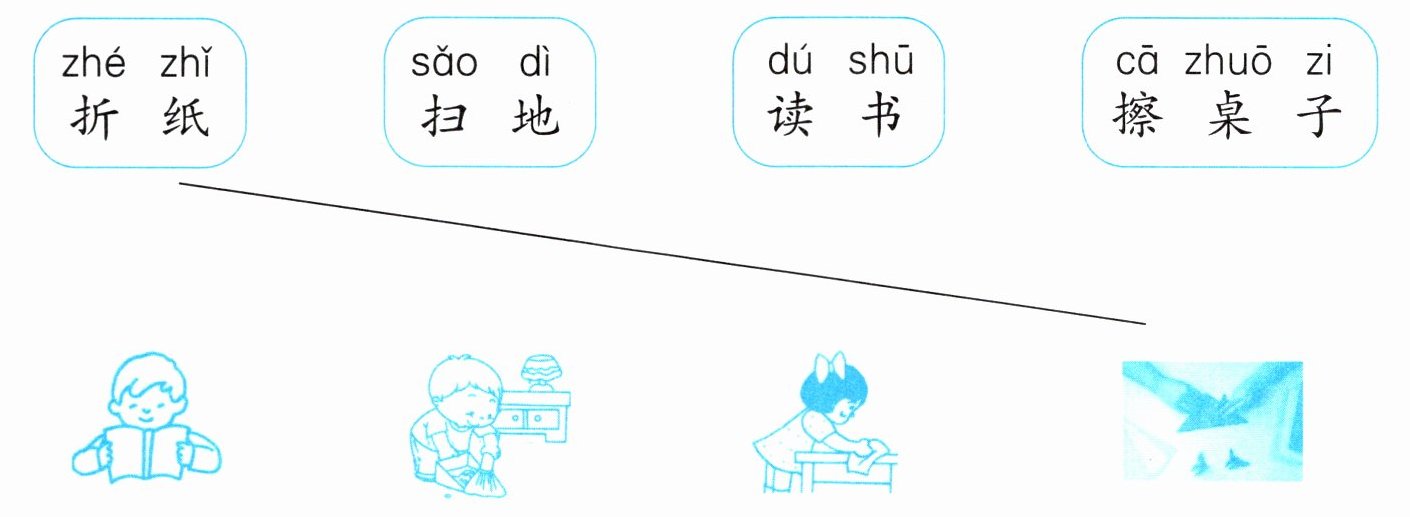 折纸连第四幅图,扫地连第二幅图,读书连第一幅图,擦桌子连第三幅图。