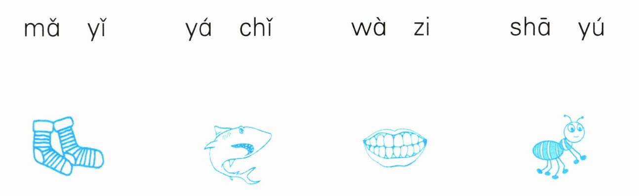 mǎ yǐ—蚂蚁图,yá chǐ—牙齿图,wà zi—袜子图,shā yú—鲨鱼图
