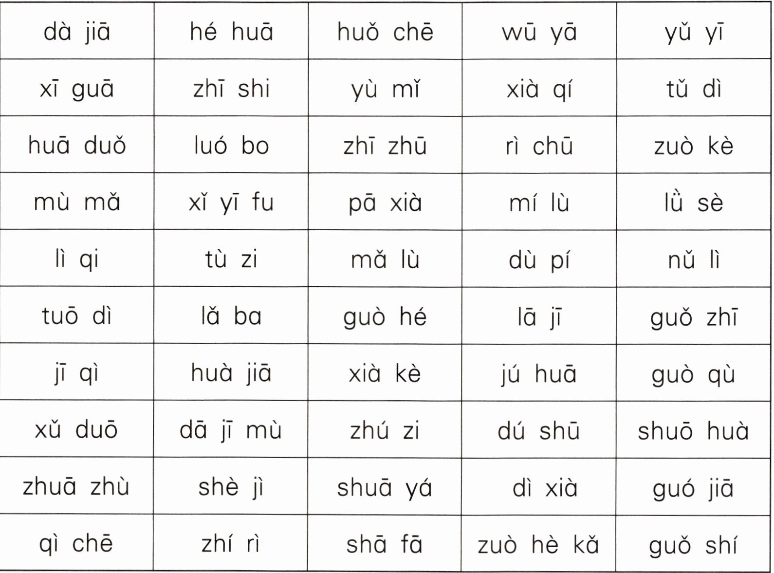dà jiā、hé huā、huǒ chē、wū yā、yǔ yī、xī guā、zhī shi、yù mǐ、xià qí、tǔ dì、huā duǒ、luó bo、zhī zhū、rì chū、zuò kè、mù mǎ、xǐ yī fu、pā xià、mí lù、lǜ sè、lì qi、tù zi、mǎ lù、dù pí、nǚ lì、tuō dì、lǎ ba、guò hé、lā jī、guǒ zhī、jī qì、huà jiā、xià kè、jú huā、guò qù、xǔ duō、dā jī mù、zhú zi、dú shū、shuō huà、zhuā zhù、shè jì、shuā yá、dì xià、guó jiā、qì chē、zhí ri、shā fā、zuò hè kǎ、guǒ shí。