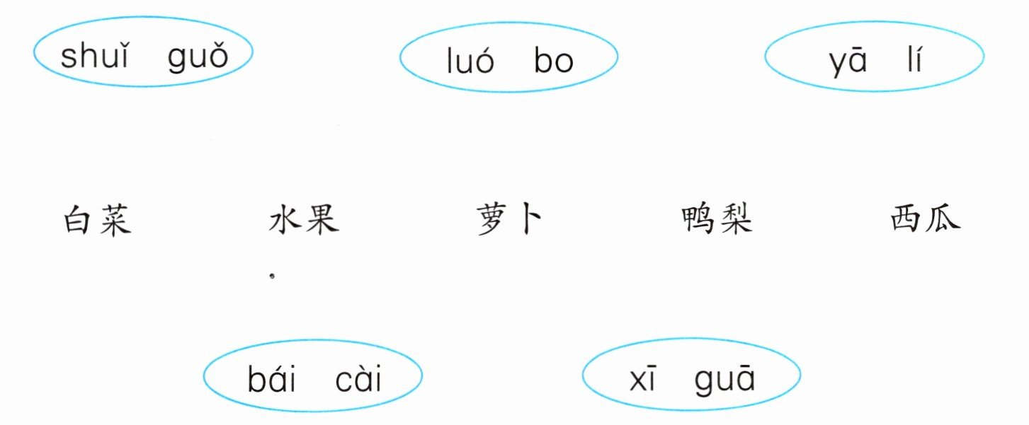 shuǐ guǒ—水果;luó bo—萝卜;yā lí—鸭梨;bái cài—白菜;xī guā—西瓜