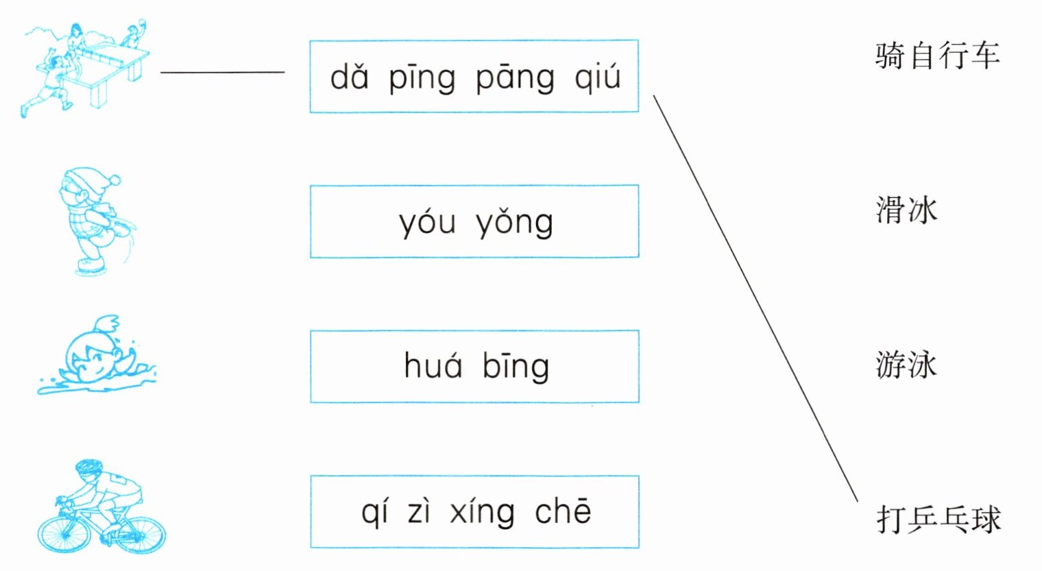 dǎ pīng pāng qiú——打乒乓球;huá bīng——滑冰;yóu yǒng——游泳;qí zì xíng chē——骑自行车 (以连线形式呈现答案,由于是文字描述,故如此表述)