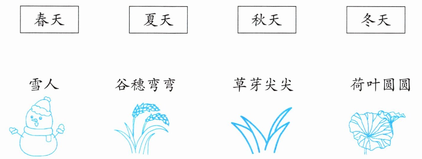 春天——草芽尖尖;夏天——荷叶圆圆;秋天——谷穗弯弯;冬天——雪人
