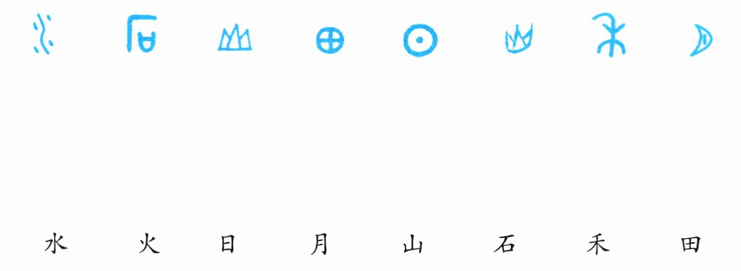 三、 ![img alt=4-1] 水 ![img alt=4-2] 火 ![img alt=4-3] 日 ![img alt=4-4] 月 ![img alt=4-5] 山 ![img alt=4-6] 石 ![img alt=4-7] 禾 ![img alt=4-8] 田