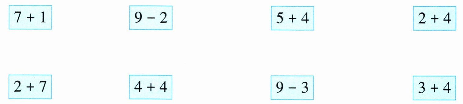 $8 - 3 =$ $4 + 5 =$ $5 + 3 =$ $7 - 5 =$ $2 + 5 =$ $1 + 8 =$