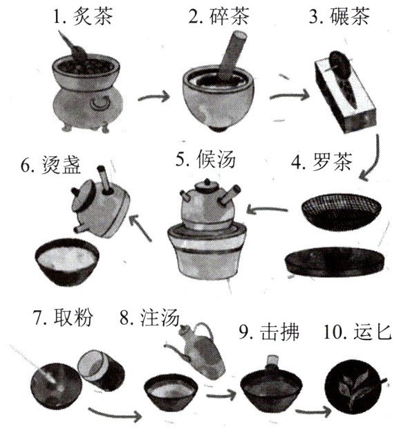 先将茶烘干捣碎,在石臼中碾碎成粉末,用竹筛过滤。把汤水烧开烫茶盏,将粉放碗中,倒入热水,用茶筅顺时针搅拌茶汤不少于20分钟,再用茶匙在泡沫上作画。