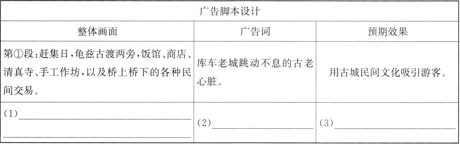 4. 南疆是很多人向往的旅游胜地,如果让你根据文章内容给库车城及周边拍一个广告,你会选取文中的哪一段或哪一个场景作为拍摄内容?请你完成广告脚本设计。(3 分)