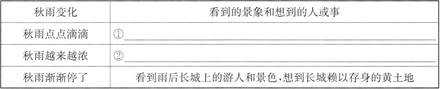 1.①看到了长城上下雨中伞、伞下游人,想到自己幼时夜读古典诗词(或与长城相关的故事、人物、诗词等)(1分)②看到雨中长城外边的景色,想到筑长城的人(或筑长城的苦难)(1分)