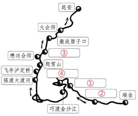 八、查阅资料,把红军长征中这四个事件的序号补充在路线图上。