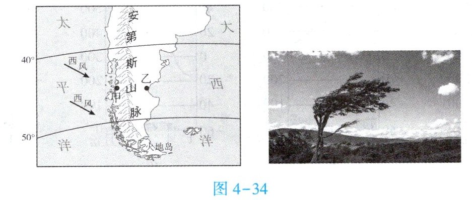 某科考队在南美洲南端进行考察时,发现甲、乙两地降水差异显著,自然景观明显不同。还发现火地岛上因风速强劲,有很多树木的树冠形状奇特,当地称作“醉汉树”。图4 - 34为南美洲南端局部示意图和“醉汉树”景观图。据此完成6~7题。