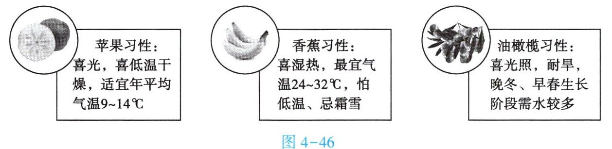 (2) 根据图4-46资料卡中三种农作物的生长习性判断,图4-45中 B 所示气候区盛产