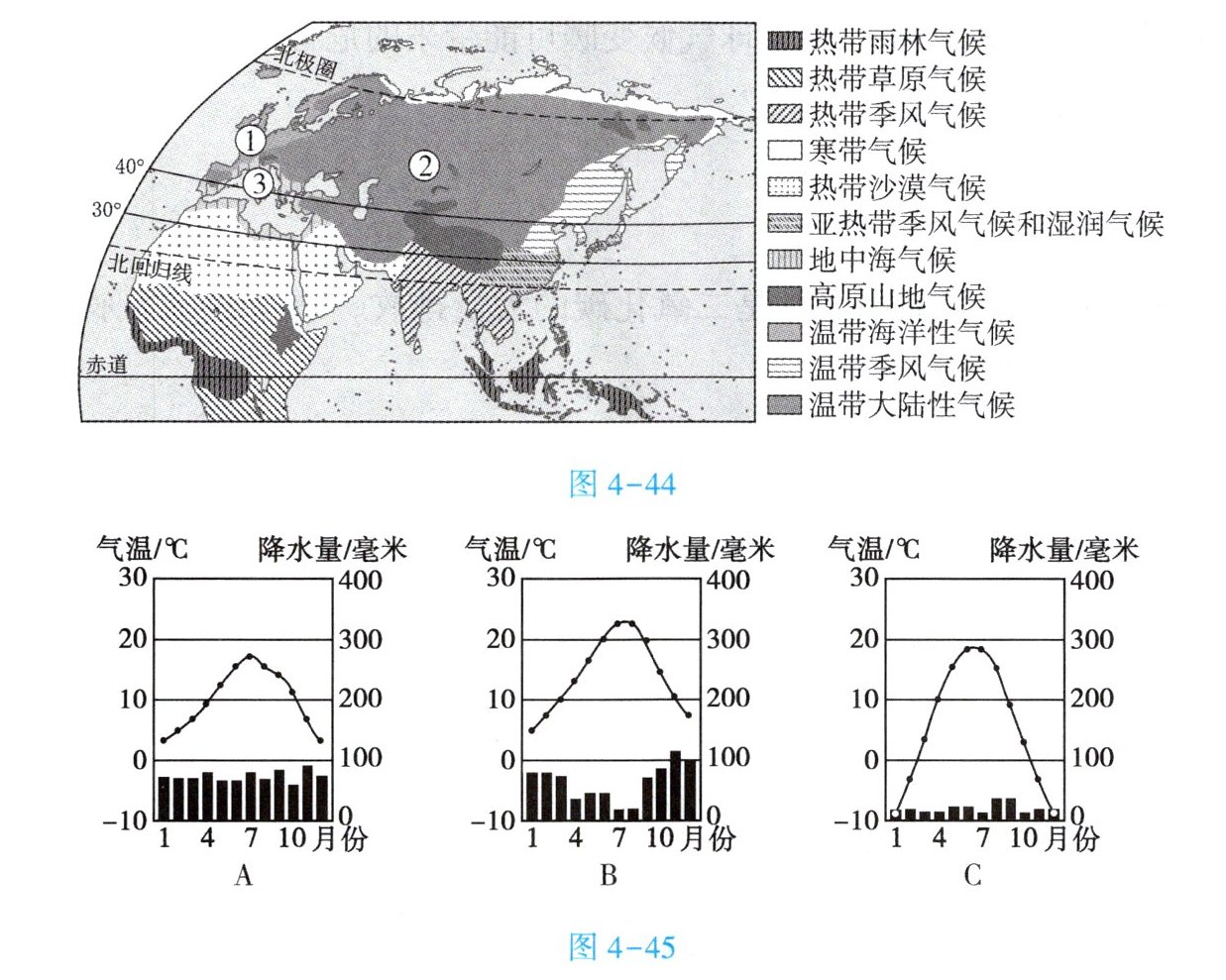 (3) 图4-44中①②③三地的气候类型与图4-45中 A 所示气候类型相对应的是