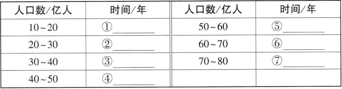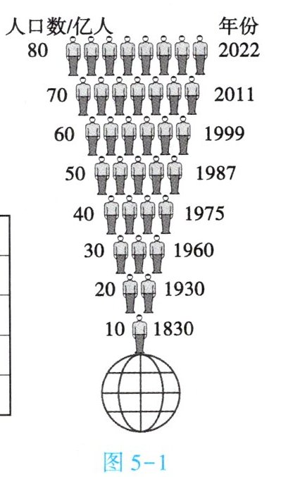 1. 读世界人口增长示意图(图 5 - 1),计算世界人口从 1830 年开始每增长 10 亿所经历的时间,并推测未来世界人口的增长趋势。