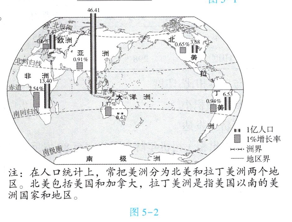 (2)用红笔在图中圈出人口增长率最高和最低的大洲。