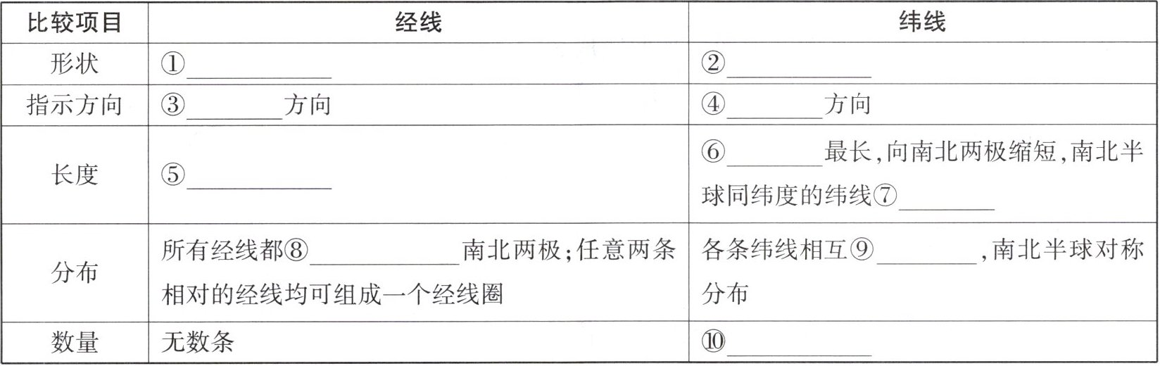 (1)①半圆 ②圆圈(或纬线圈) ③南北 ④东西 ⑤相等(或等长) ⑥赤道 ⑦相等 ⑧相交于 ⑨平行 ⑩无数条