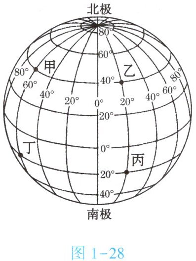 (3)甲:(60°W,60°N);乙:(40°E,40°N);丙:(20°E,20°S);丁:(60°W,20°S)