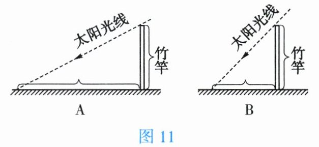 在夏至日和冬至日前后,一组同学测量并记录正午竹竿影子的方向和长度,绘制了图 11。
