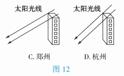 冬至日这一天,郑州的小明邀请家住杭州的表弟一起测量相同的两栋楼的正午影子长度,并绘制了图 12。