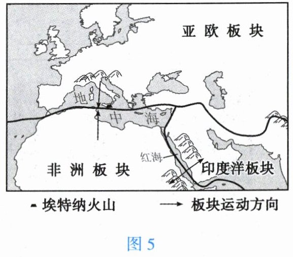 2023 年 5 月 23 日,意大利埃特纳火山再次喷发,导致附近机场关闭。火山灰中含有丰富的氮、磷、钾等元素。图 5 为世界局部地区板块分布示意图。据此完成 10~11 题。