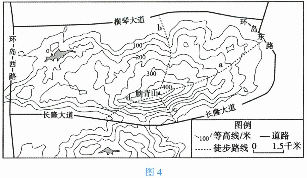 脑背山是珠海市横琴岛的最高峰,风景优美,深受徒步爱好者青睐,图 4 为脑背山周边等高线地形示意图。据此完成 8~9 题。