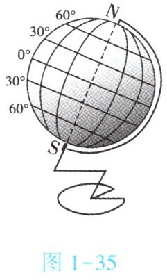 七年级学生小亮尝试自选材料制作地球仪模型(如图 1-35),并演示地球的自转。据此完成 1~2 题。