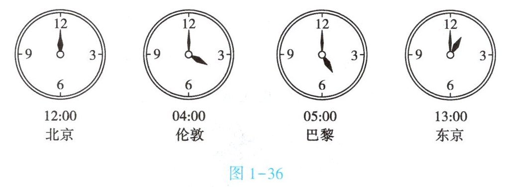 某饭店大堂悬挂了四个城市的时钟(如图 1-36)。据此完成 3~4 题。