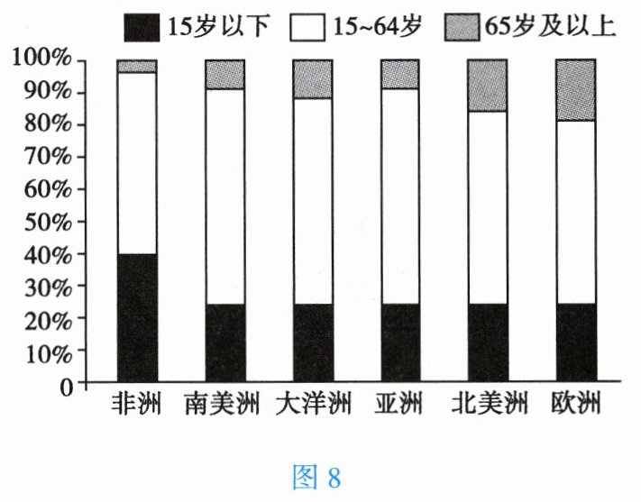 按照联合国的定义,当一个国家或地区 65 岁及以上人口占总人口的 7%,就认为该国家或地区进入老龄化社会。联合国《世界人口展望 2022》报告数据显示,世界人口老龄化正在逐步加剧。图 8 为世界各大洲不同年龄人口占比统计图(2022 年)。据此完成 17~18 题。