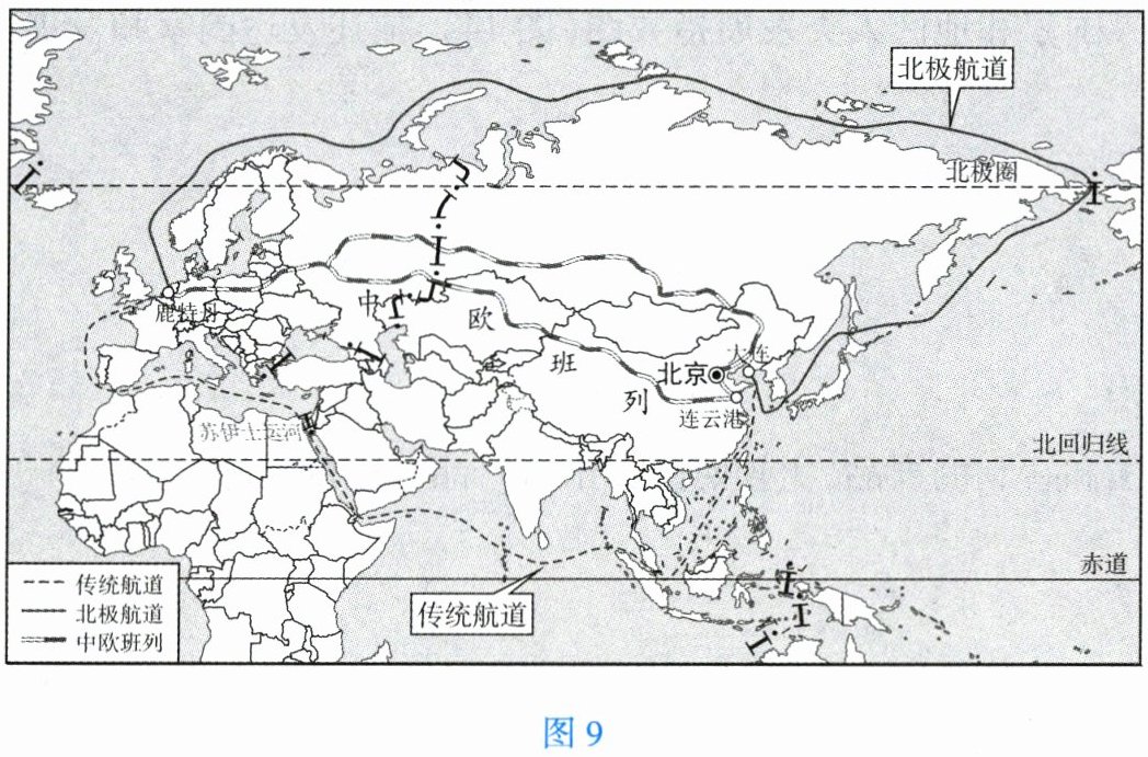 近年,北极航道和中欧班列促进了亚洲与欧洲的经济往来,被称为“冰上丝绸之路”与“钢铁丝绸之路”。图 9 为亚、欧两洲海上和陆地贸易路线示意图。据此完成 19~20 题。