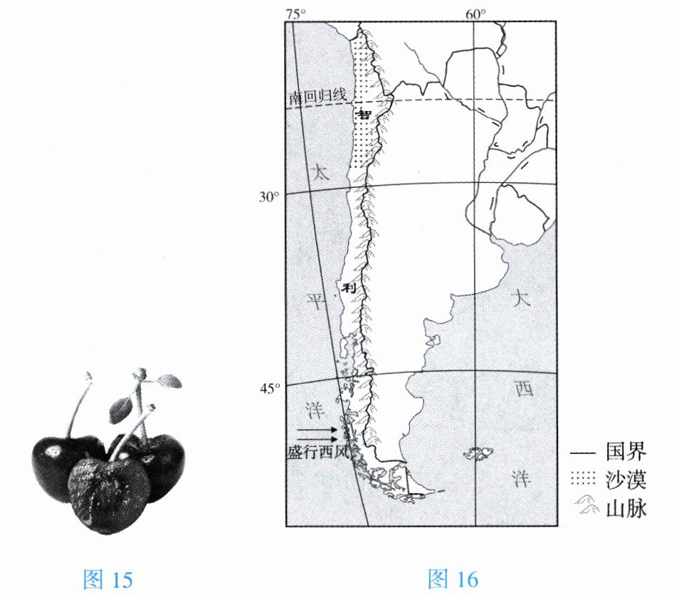 车厘子(图 15)喜光、喜温,适宜的生长环境是光照充足、年均气温在$15^{\circ }C$左右、年降水量在 400~800 毫米、土质疏松的沙壤土。智利是全球第一大车厘子生产国和出口国,车厘子的上市时间为 10 月底至次年 3 月,12 月最为集中。红色的车厘子颜色喜庆,是走亲访友表达美好祝愿的佳品,常年“霸屏”我国春节档。图 16 为智利位置示意图。