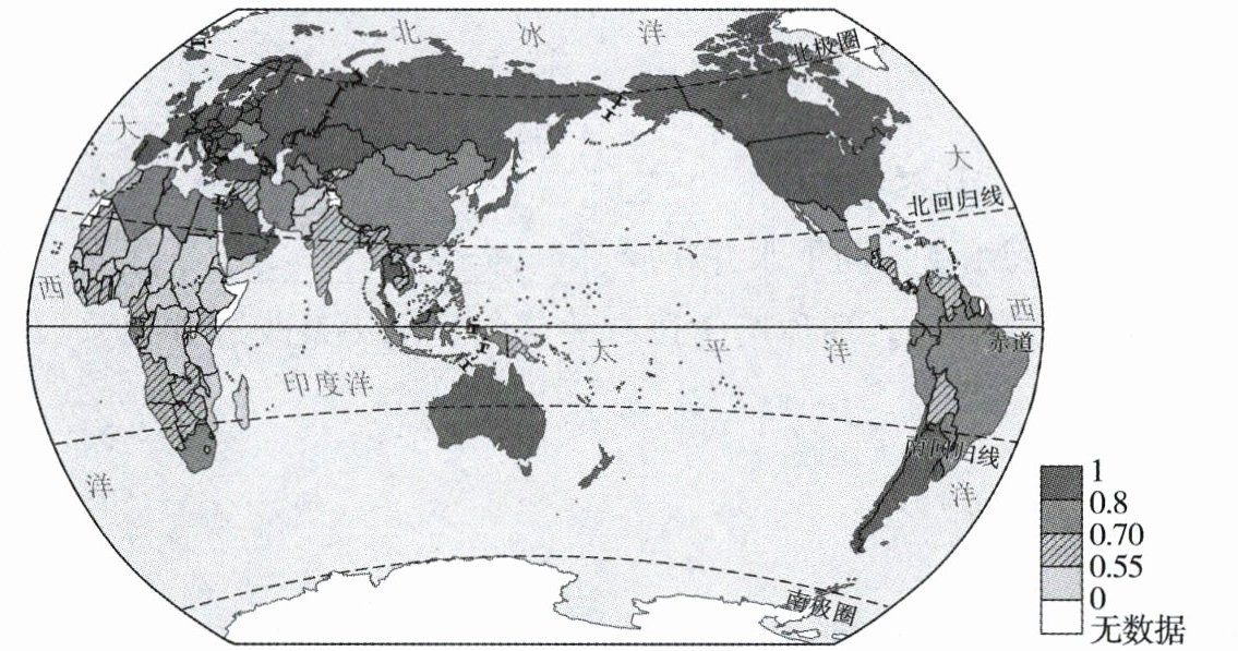 (1)结合世界国家和地区人类发展指数图(图 14),描述发达国家和发展中国家的分布特征。(2 分)