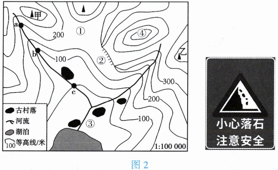 某中学研学小组利用周末到某地进行研学。图 2 为研学地点所处区域局部等高线地形示意图和相关警示牌。据此完成 3~5 题。