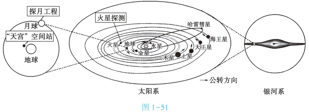 图 1 - 51 示意地球在宇宙中的位置以及中国太空探索的部分方式。据此完成 1 ~ 2 题。