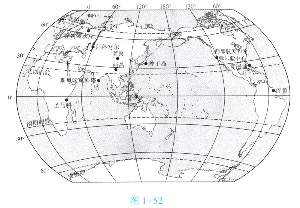 图 1 - 52 为世界部分卫星发射基地分布示意图。据此完成 5 ~ 7 题。