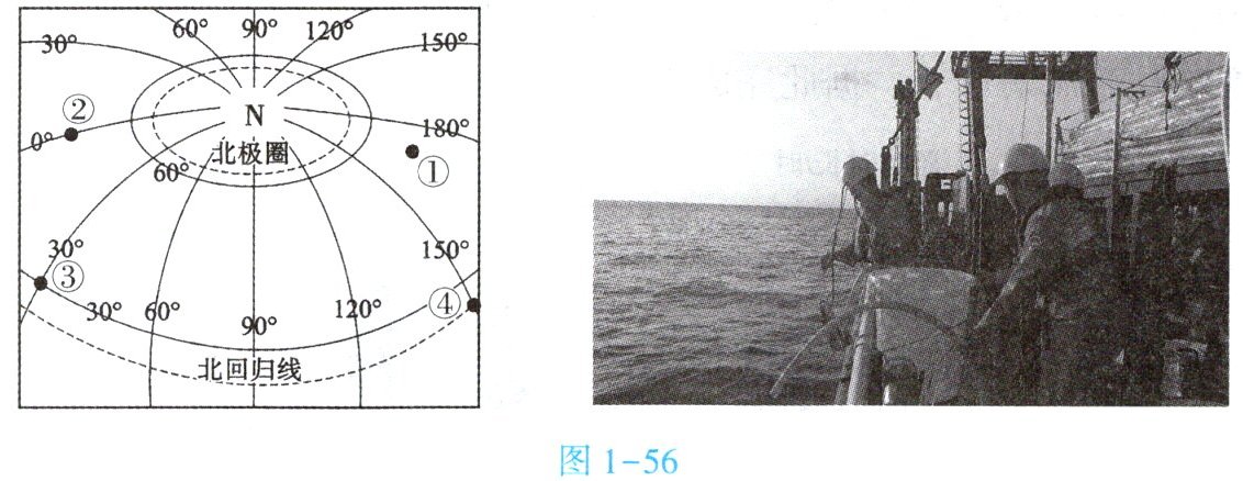 材料 中国航海博物馆联合中国远洋海运集团在四大洋采集海水样本,助力科学研究。其中,北冰洋(约 $54^{\circ}N$,$179^{\circ}E$)的采集任务难度最高。图 1 - 56 为北极地区周边经纬网示意图及海水采集景观图。