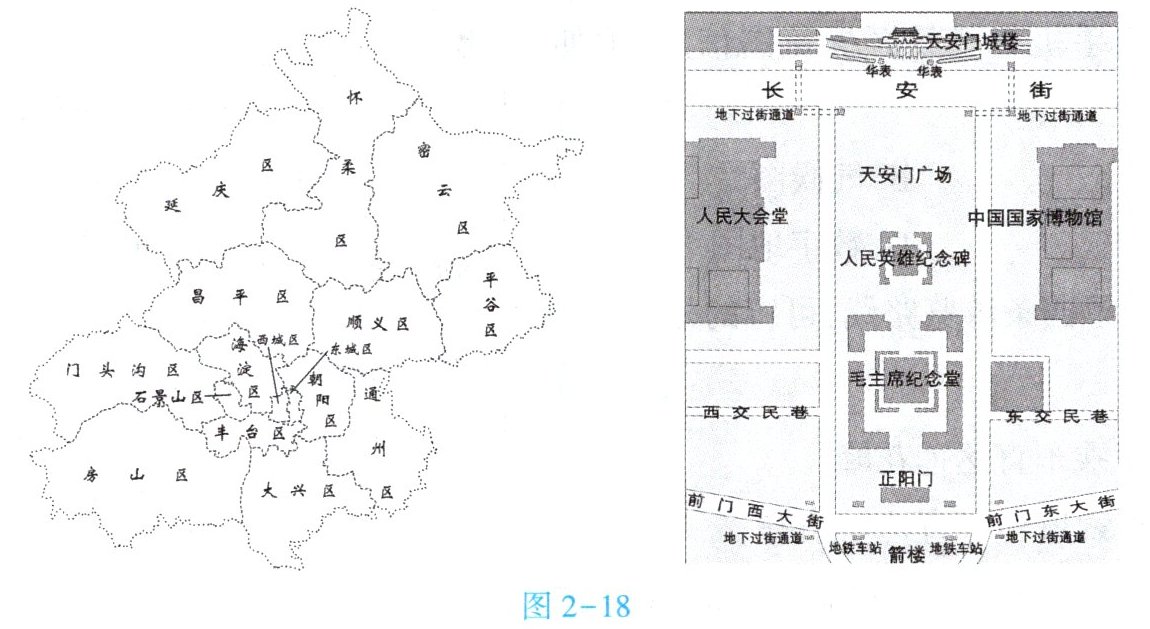 2. 读北京市行政区划图和天安门广场导游图(图 2 - 18),比较地图的比例尺大小。