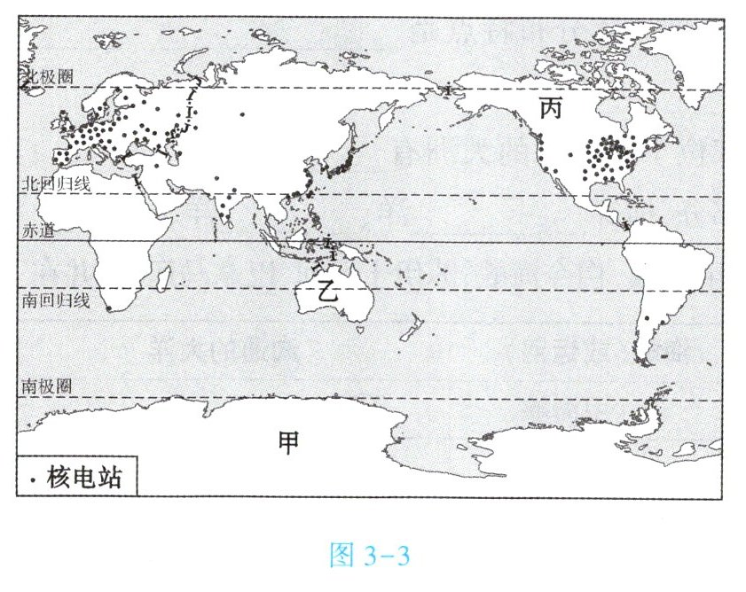 目前,我国已成为全球少数几个拥有比较完整核工业体系的国家之一,核电技术水平和综合实力跻身世界第一方阵。核电的重要原料为铀矿石。图3 - 3为全球核电站分布示意图。据此完成3~5题。