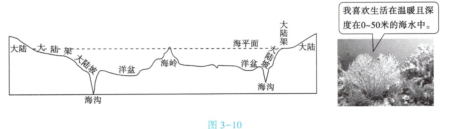 当主人公走出“鹦鹉螺”号步入水中,看到这里生长了很多异常美丽、形态各异的珊瑚。图 3 - 10 示意海底地形分布和珊瑚生长习性。