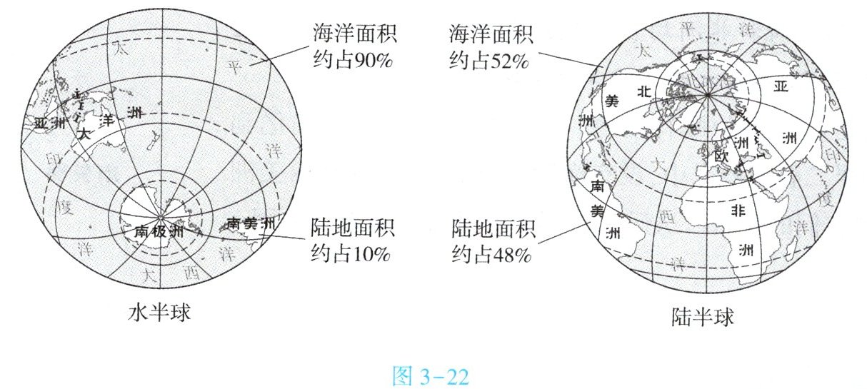 水半球是海洋分布最集中的半球,陆半球是陆地分布最集中的半球。图 3 - 22 为水、陆半球示意图。据此完成 1 ~ 2 题。