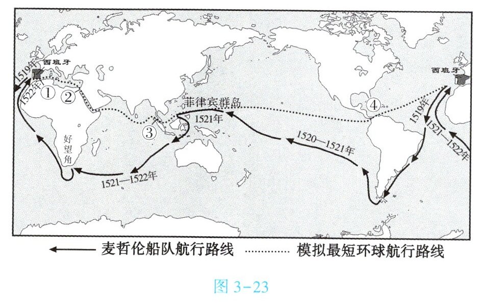 1519 年 9 月,麦哲伦率领船队从西班牙出发开始人类首次环球航行,1522 年 9 月船队返回西班牙。图 3 - 23 为麦哲伦船队航行路线示意图。据此完成 3 ~ 4 题。