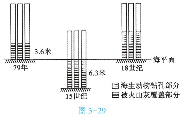 材料二 公元前 2 世纪,维苏威火山附近的那不勒斯海岸曾建造了塞拉比斯神庙,现在只保存下来三根大理石柱,石柱的部分已被海生动物钻成许多小孔。图 3 - 29 为三根大理石柱升降变化示意图。