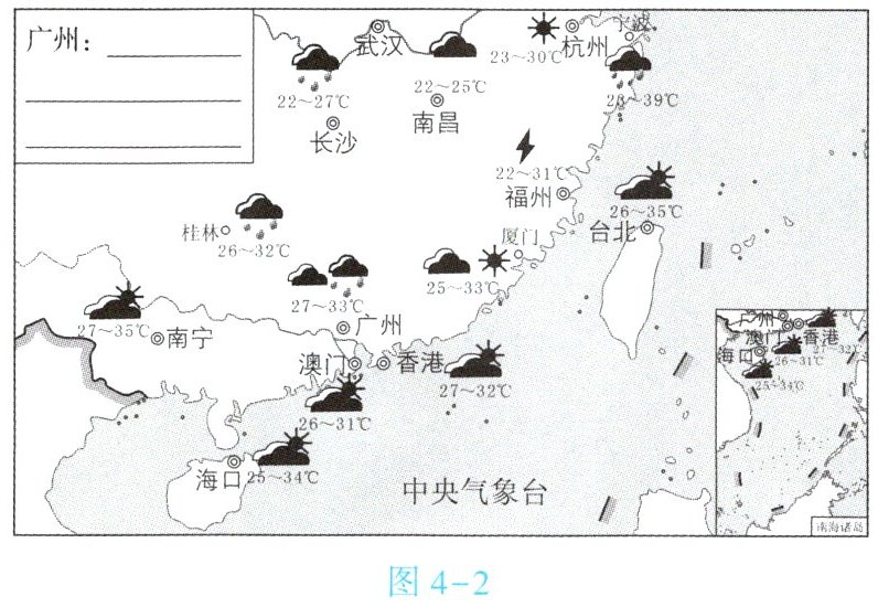 3. 读城市天气预报图(图4-2),模仿天气预报员播报广州天气情况,并为其提供一条生活指南。