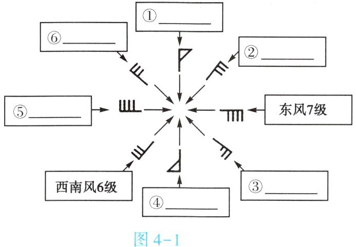 2. 观察风向图(图4-1),写出风向和风力等级。