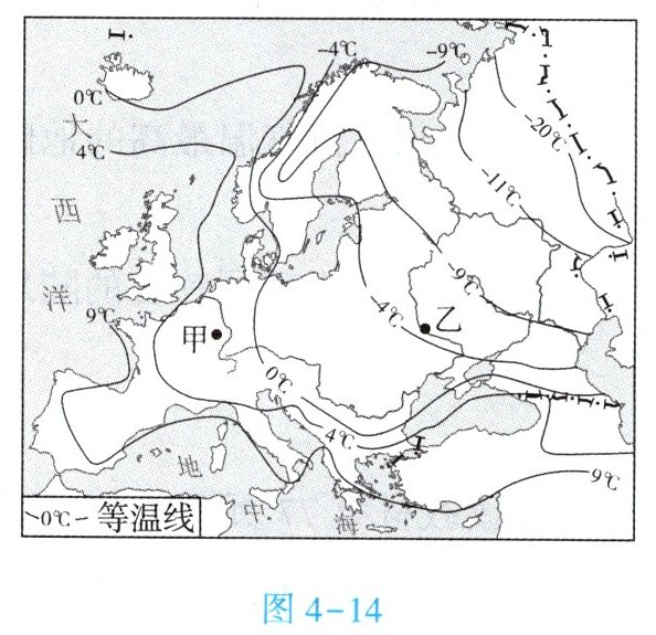 图 4 - 14 为欧洲 1 月等温线分布示意图。据此完成 4~6 题。