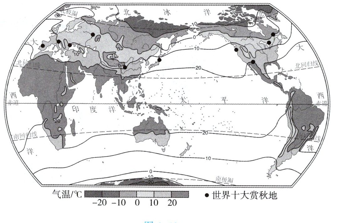 秋天是多彩的季节,某地理类杂志选出全球十大赏秋地。图 4 - 13 是世界年平均气温和全球十大赏秋地分布示意图。据此完成 1~3 题。