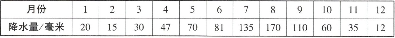 |降水量/毫米|20|15|30|47|70|81|135|170|110|60|35|12|