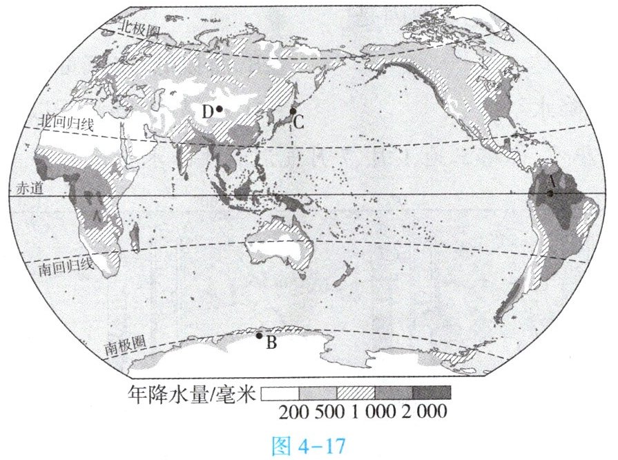 2. 读世界年降水量分布示意图(图4-17),归纳世界年降水量分布规律。