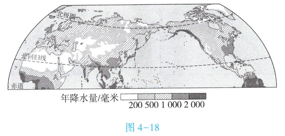 图4-18是北半球年降水量分布示意图。据此完成3~4题。